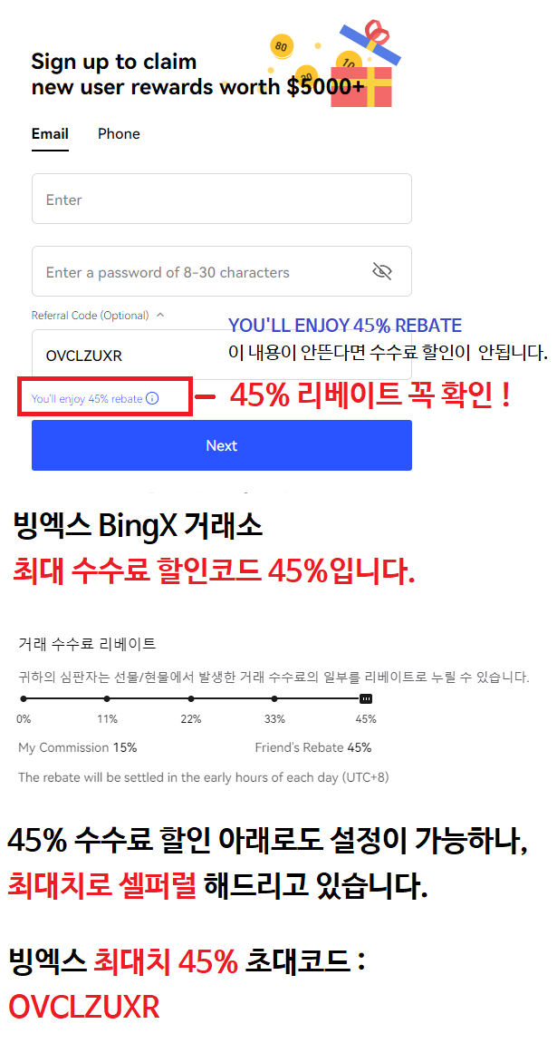 빙엑스 BingX 수수료 45% 최대치 평생 수수료 할인코드 : OVCLZUXR